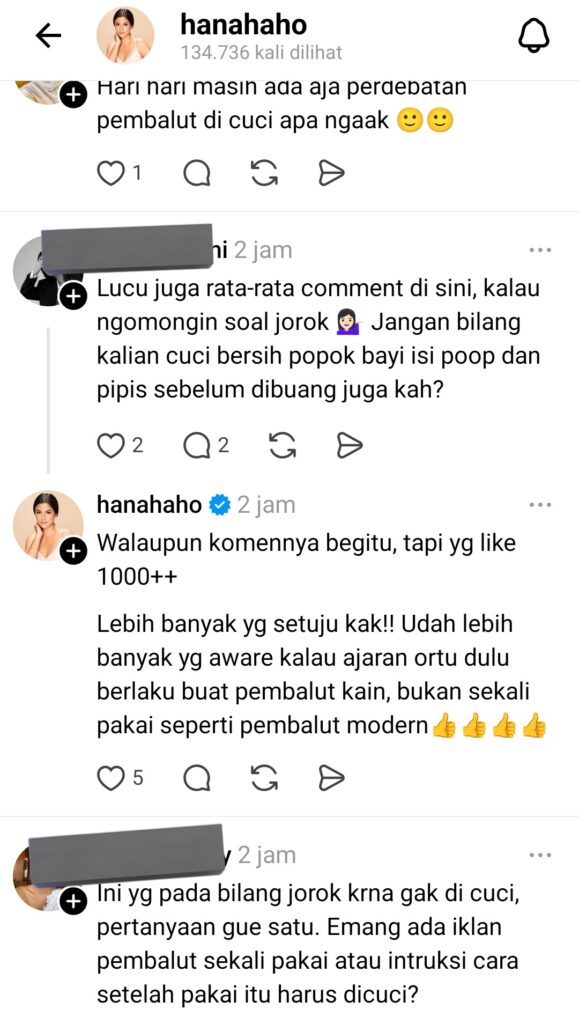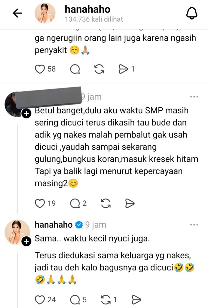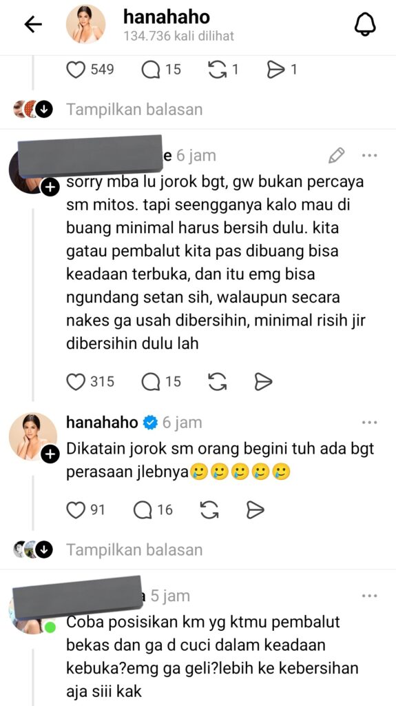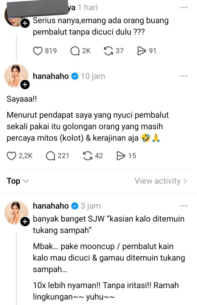 Hana Saraswati langsung membalas utas tersebut dengan komentar yang blak-blakan: “Sayaaa!! Menurut pendapat saya yang nyuci pembalut sekali pakai itu golongan orang yang masih percaya mitos (kolot) & kerajinan aja.”
